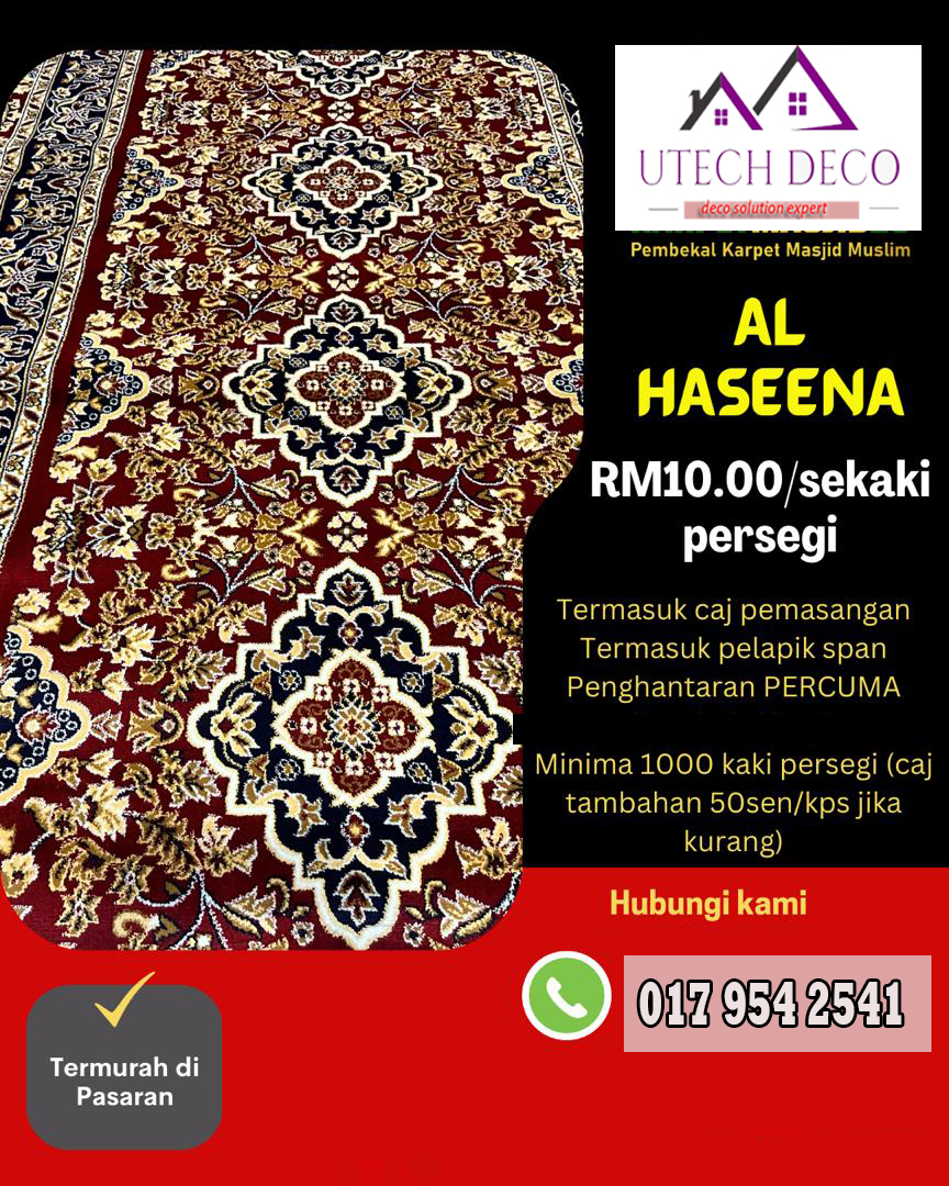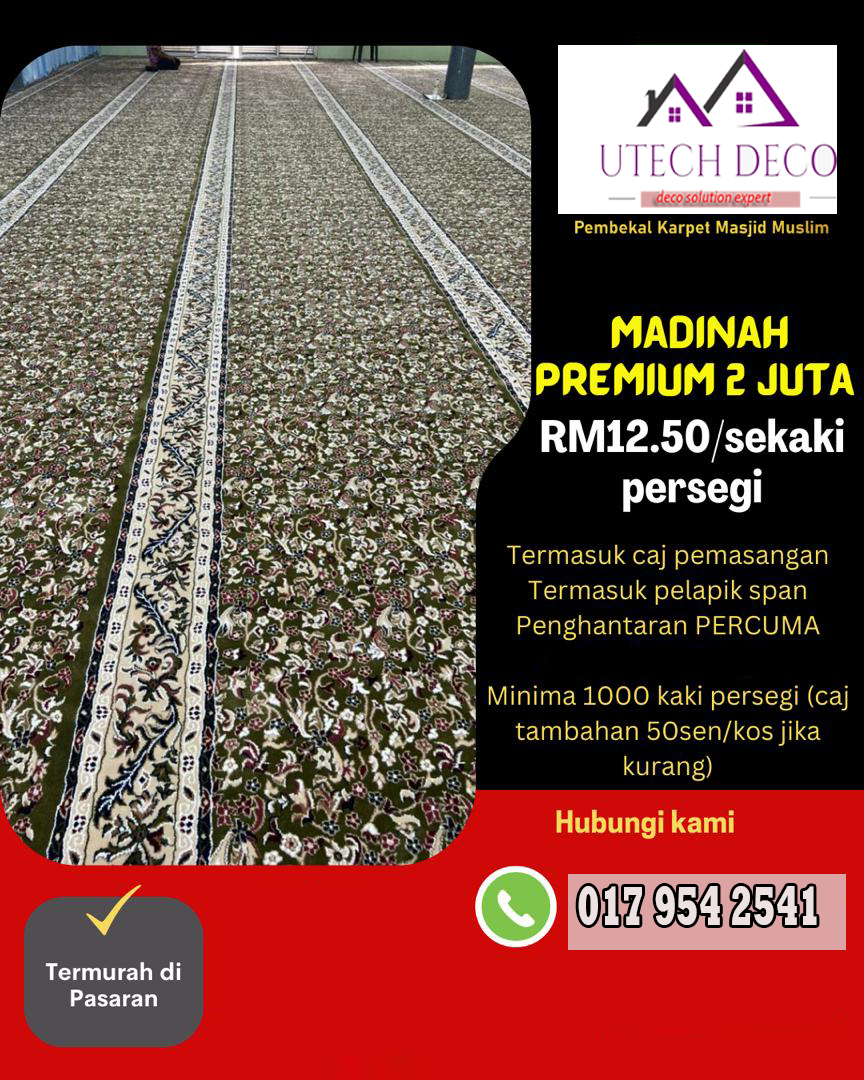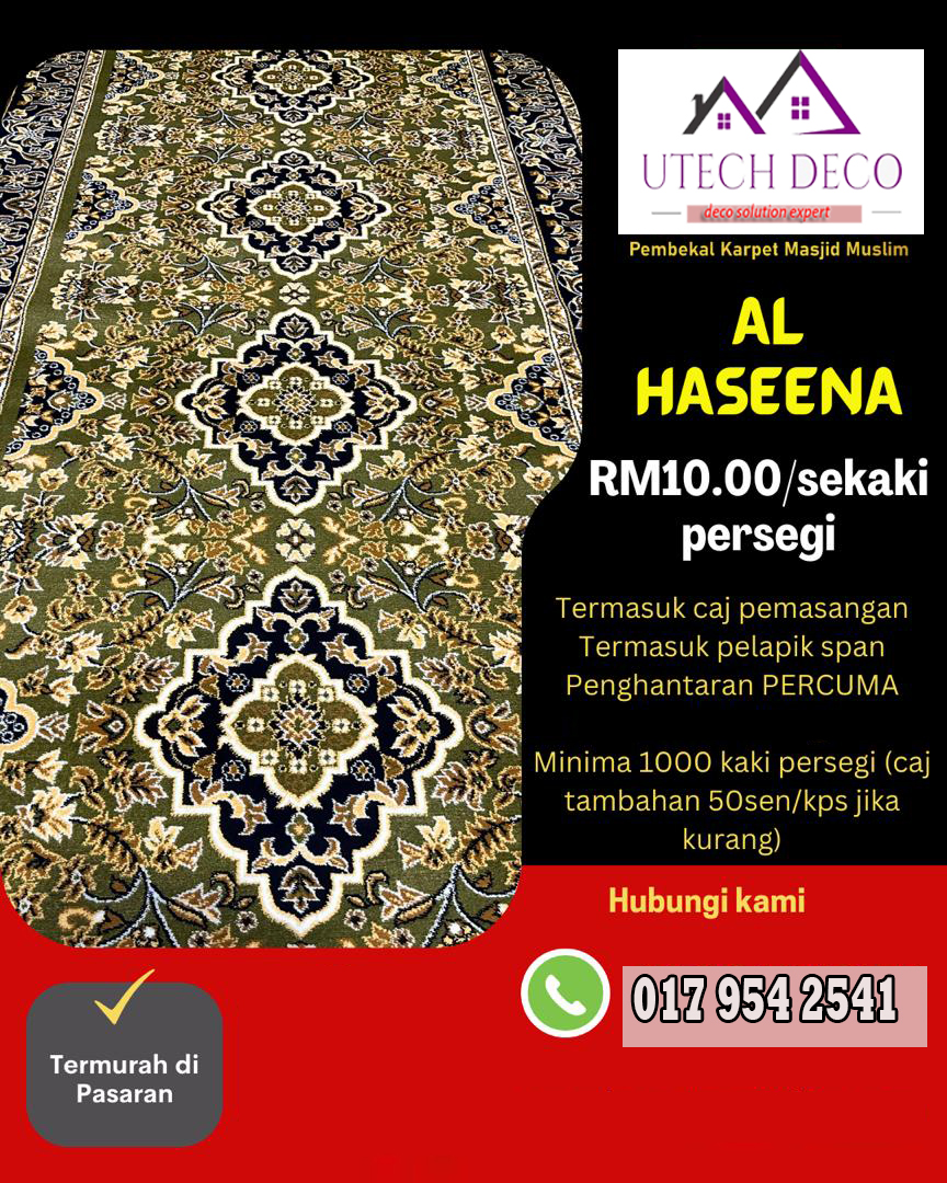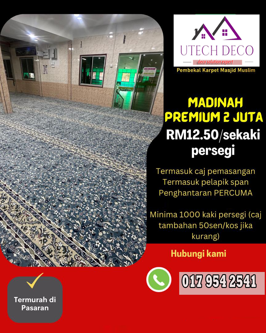 Karpet yang lembut dan selesa adalah asas kepada setiap ruang solat. Kami menawarkan karpet dengan pelbagai corak dan warna yang direka khas untuk keselesaan dan keindahan. Setiap karpet dipilih dengan teliti untuk memastikan ia selesa digunakan dan tahan lama.